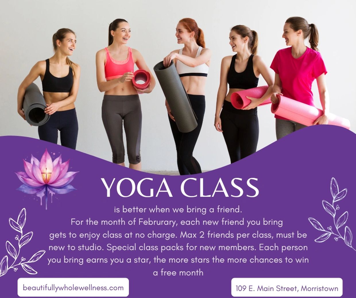 Bring up to 2 new friends to per class and they get to attend for free. They must be new to the studio and can attend one class free. There will be special class packs and monthly rates for any new members. For each friend you bring - earn a sticker - at the end of the month, the person with the most stickers wins a free month of classes! Let the challenge begin!